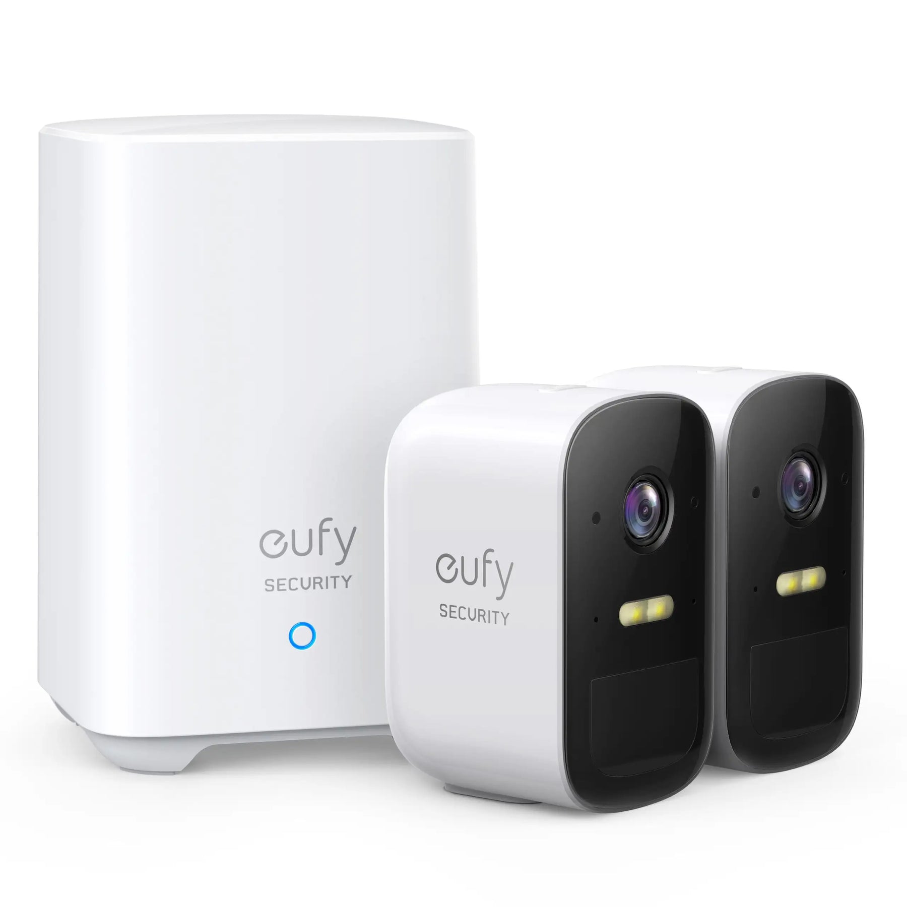 Eufy EufyCam 2C Kit innehåller två batteridrivna Full HD-kameror samt en basstation för krypterad, lokal lagring. Perfekt för villa, radhus, garage eller fritidshus.